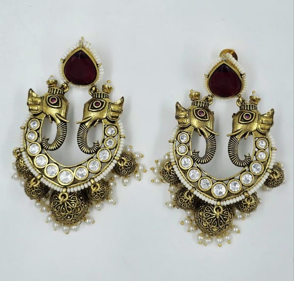 These stunning traditional Indian jhumka earrings are crafted in a rich golden tone, showcasing an intricate elephant motif at the top of the jhumka dome. The elephants are adorned with small red accents, possibly representing eyes or decorative elements. The main hoop of the earring and the base of the jhumka are encrusted with sparkling white cubic zirconia or similar stones, framed by delicate white pearls. Multiple miniature golden jhumkas, each tipped with a small white pearl, dangle elegantly from the main dome, creating beautiful movement and sound. The top stud of the earring features a prominent, deep maroon teardrop-shaped stone set in a golden frame, adding a touch of regal colour. These statement earrings are perfect for festive occasions, weddings, or traditional attire, offering a blend of classic design and dazzling embellishment.