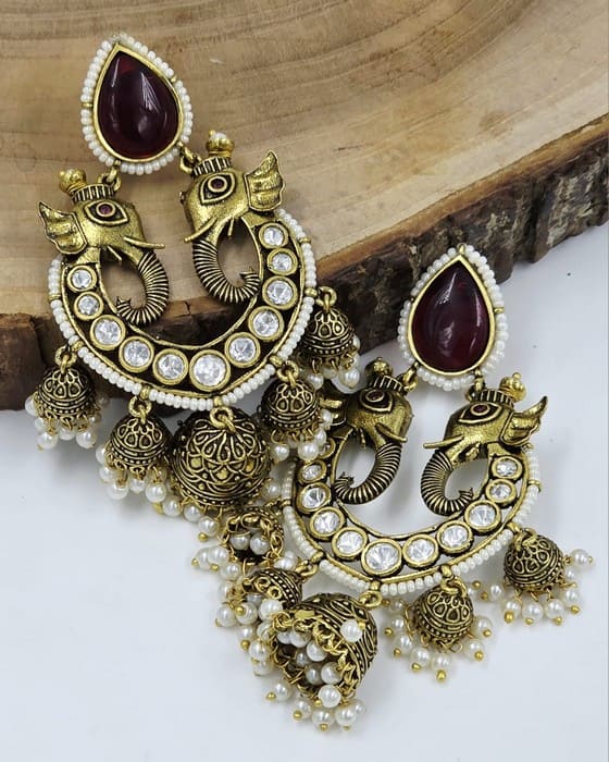 Exquisite golden elephant motif jhumka earrings featuring sparkling white stones, delicate pearl accents, and a striking maroon teardrop top stone.