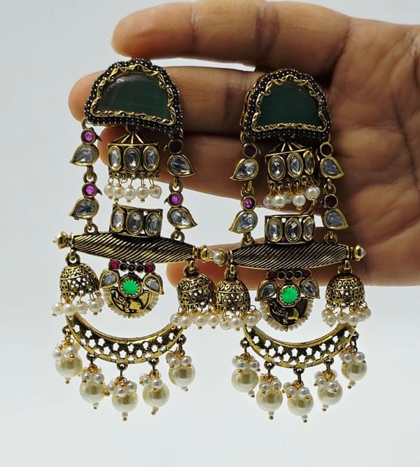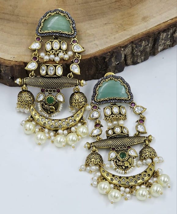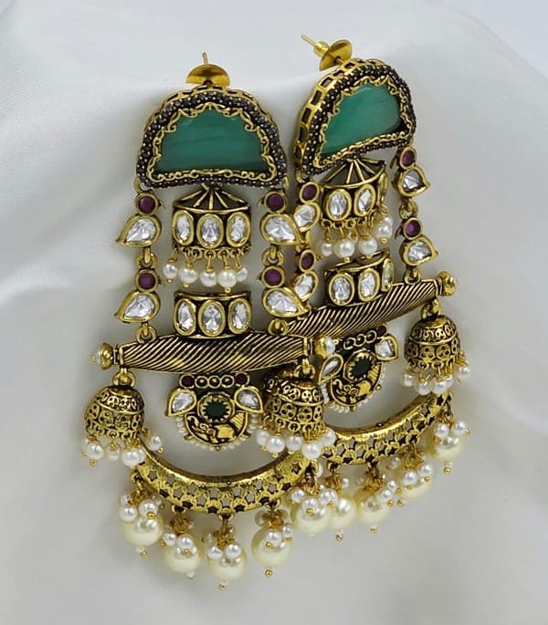 These magnificent chandelier earrings are a testament to elaborate traditional design, crafted with an antique gold finish. The top section features a substantial curved green stone, possibly a polished natural stone or enamel, set in a gold frame. Below this, the earring descends in multiple tiers of intricate detail. The upper tiers are adorned with clear sparkling stones and small red accents, possibly rubies or synthetic, interspersed with delicate white pearls. A horizontal bar with textured detailing connects sections in the middle. The lower part of the earring showcases a prominent semi-circular or crescent-shaped white enamel base, beautifully accented with a central green stone and flanked by miniature, intricately detailed jhumkas. The entire bottom edge is fringed with numerous lustrous white pearls. These grand earrings are designed to make a luxurious statement, ideal for major festive occasions, weddings, and traditional Indian ceremonies.