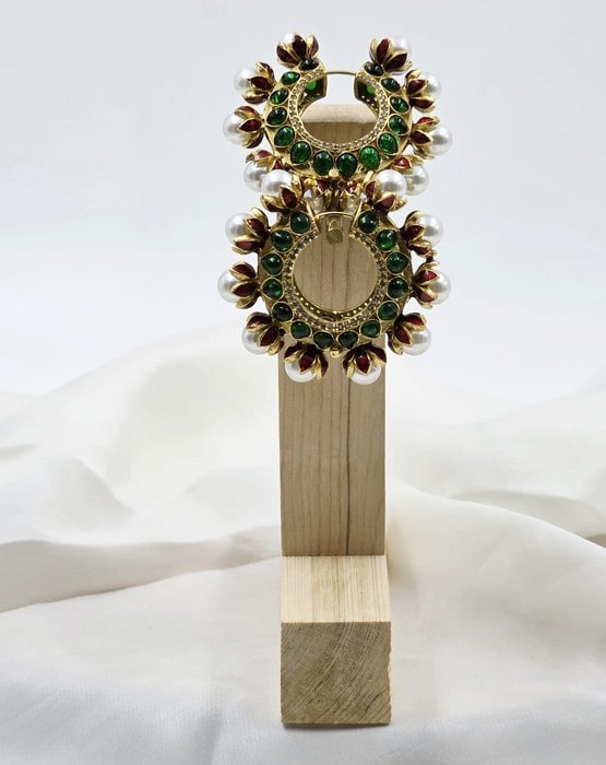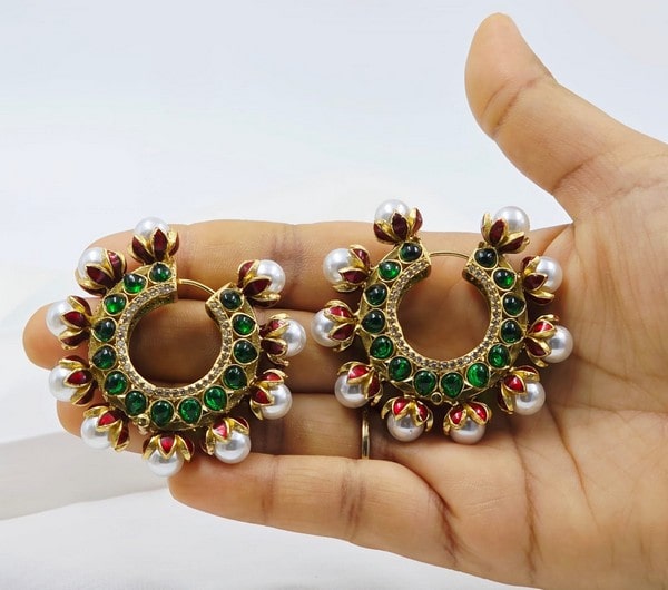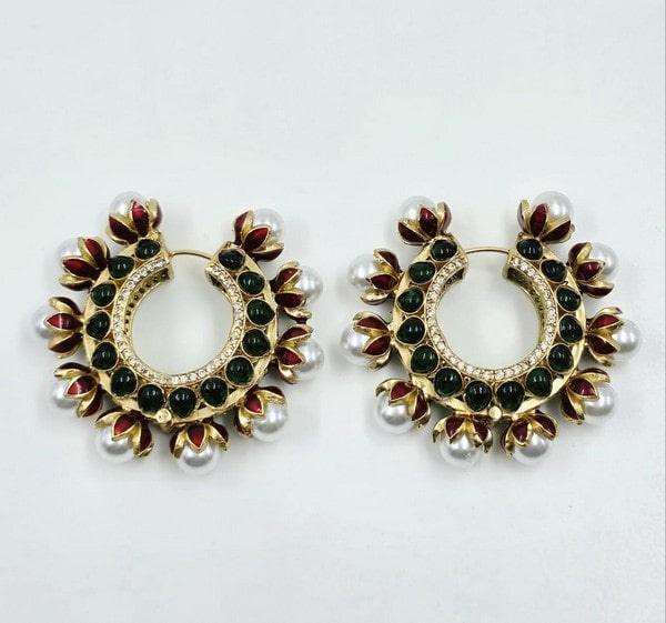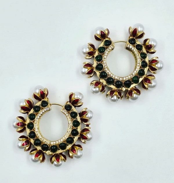 These magnificent gold-toned half-hoop earrings are a true testament to intricate artistry and features a beautifully sculpted flower motif at its top, adding a regal and traditional touch. The body of the half-hoop is richly embellished with alternating emerald green and ruby red teardrop-shaped stones, meticulously set to create a striking contrast and a burst of colour. These colourful stones are complemented by sparkling clear studded accents, enhancing the overall brilliance of the piece. The base of the hoop is adorned with a delicate fringe of lustrous white pearls, adding graceful movement and a classic finish. These opulent earrings blend traditional Indian motifs with a timeless design and a rich colour palette, making them an ideal accessory for weddings, grand celebrations, and other special events where you wish to exude elegance and charm.
