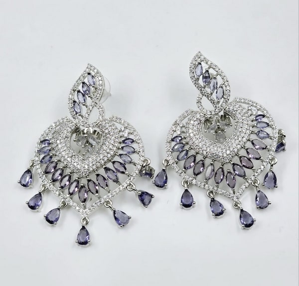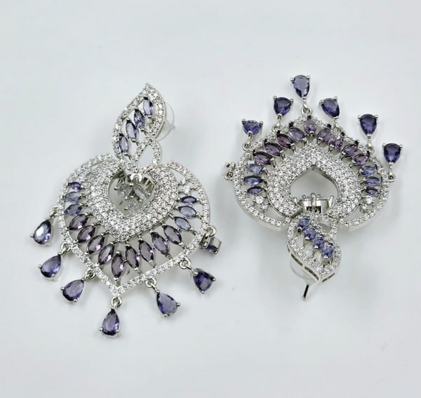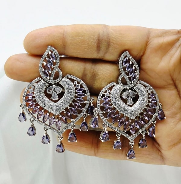 Make a stunning impression with these magnificent Grand Amethyst Purple & American Diamond Crescent Dangle Earrings, designed for unparalleled brilliance and regal charm. Crafted with a gleaming silver-toned finish, each earring showcases a sophisticated, ornate top stud leading to a dramatic wide crescent-shaped main body. This elaborate form is entirely encrusted with countless radiant American Diamonds (Cubic Zirconia), creating an extraordinary all-over sparkle. The intricate setting and arrangement of the clear stones highlight the meticulous craftsmanship. Cascading gracefully from the bottom edge of the crescent are numerous pear-shaped crystals in a captivating amethyst-purple, adding a vibrant pop of colour and graceful movement. These substantial and opulent earrings are perfect for weddings, grand celebrations, or any formal event where you desire to make a luxurious and unforgettable statement.