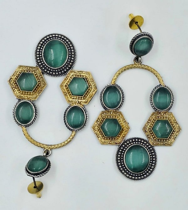 These modern and stylish drop earrings showcase a captivating blend of oxidized silver and antique gold tones, creating a unique visual appeal. Each earring begins with a prominent oval or round smooth green stone stud. Below this, a golden textured arch connects to a series of geometric elements. The design features a symmetrical arrangement of smooth, polished green stones in various shapes – primarily round and hexagonal. These stones are set alternately in textured oxidized silver frames and textured golden frames, creating an intriguing contrast in both colour and texture. The interplay of the different metal finishes and geometric shapes gives these earrings a sophisticated yet contemporary look. They are perfect for adding a touch of modern elegance to both traditional and Western outfits, suitable for casual wear or more dressed-up occasions.
